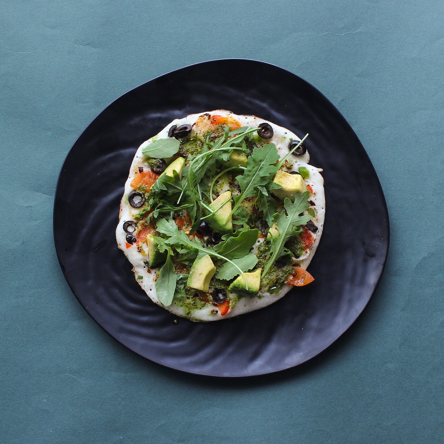 Classic Uttapam (rice pancake) with olives, chili, mixed greens, avocado, and pesto